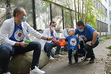 Bei der Ziehung der Lose trug der Junge deshalb sein blaues Aktions-T-Shirt mit dem Aufdruck „Ich lauf um Dein Leben“. Bei diesem Spendenlauf kann aktuell jeder mitmachen und die Initiative zum Beispiel mit dem Kauf eines T-Shirts unterstützen. Die Spendengelder kommen dem Aktionsbündnis Angeborene Herzfehler zugute. Sie fließen unter anderem in Informationsmaterial und Aufklärungskampagnen und unterstützen damit Kinder, die auf ein Spenderherz warten. PD Dr. Christian Heim, Tagungssekretär der Veranstaltung „Herzmedizin 2021“ und stellvertretender Direktor der Herzchirurgischen Klinik (Direktor: Prof. Dr. Michael Weyand) des Uni-Klinikums Erlangen, sagte: „Wir freuen uns, dass wir mittlerweile über 2.000 Unterstützerinnen und Unterstützer gewonnen haben, die ihr Engagement in den sozialen Medien teilen und damit noch mehr Menschen auf Kinder wie Jakob aufmerksam machen. Bis heute sind schon über 40.000 Euro zusammengekommen!“ Die Spendenaktion soll bis mindestens zum Jahresende weiterlaufen. Das nächste Etappenziel wird am Tag der Organspende am 5. Juni 2021 bekannt gegeben. Kinderkardiologe Prof. Dittrich erklärte: „Das Thema Organspende muss stärker in die Köpfe der Menschen – damit schwer herzkranken Kindern besser geholfen werden kann. Auch für Jakob ist sein Kunstherz nur eine Übergangslösung, die ihn in vielen Bereichen ausbremst – zum Beispiel in seinem Bewegungsdrang, in Wachstum und Entwicklung. Er braucht deshalb schnellstmöglich ein echtes Herz.“